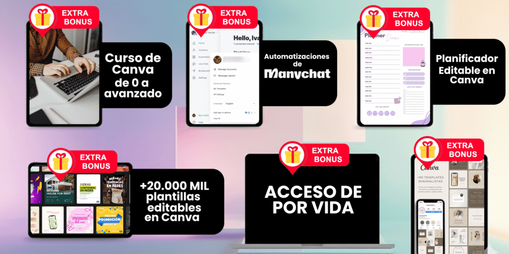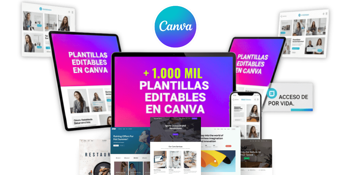 Incluyen diseños para posts, historias, flyers, portadas, presentaciones, carruseles y más, todos 100% editables en Canva.